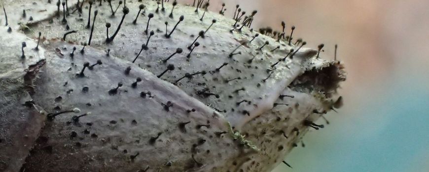 Nature TodayDe piepkleine rododendronknopvreter is geen heel algemene paddenstoel, maar daar waar rododendrons staan, moet je hem kunnen vinden. Je ziet de sprieterige paddenstoelen alleen op de dode, bruine knoppen van rododendrons, als minuscule zwarte speldenknopjes. Het schijnt dat de schimmel verspreid wordt door de rododendroncicade, een knalgroen insect met twee rode lengtestrepen. De nimfen, of onvolwassen exemplaren, van deze cicadesoort voeden zich met de knoppen van de plant.