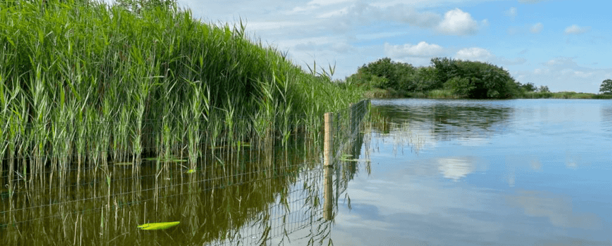 Om het bestaande en nieuw aangegroeide riet te beschermen, worden ook ganzenrasters geplaatst, een essentieel onderdeel van het herstelproject. “Met name jonge rietscheuten worden heel snel weggevreten door ganzen”, vertelt Peter. “De rasters verplaatsen we mee met de aangroei. Soms wel tien jaar. In die periode kan het riet sterk genoeg worden, zodat er uiteindelijk geen rasters meer nodig zijn.”