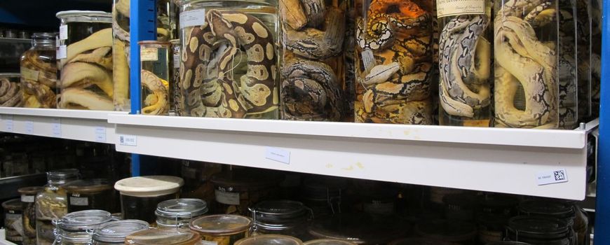 Een deur verder, in de collectie, staan rijen en rijen aan stellingkasten, met op de planken ontelbaar veel glazen potten. Slangen, kikkers, leguanen en nog meer reptielen en amfibieën staan hier op sterk water. Dondorp kijkt om zich heen: “Al deze stukken hebben hun eigen verhaal. Voor de wetenschap is deze collectie echt een schatkamer.”