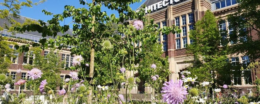 Beeld: Dominic Dijkshoorn (leadfoto: een van de onderzochte locaties is het voorplein van de faculteit Bouwkunde, waar van 2024 tot 2025 de bestrating grotendeels is verwijderd en een wadi met stadsklimaatbos is aangelegd); Menno Reemer; Gert Huijzers