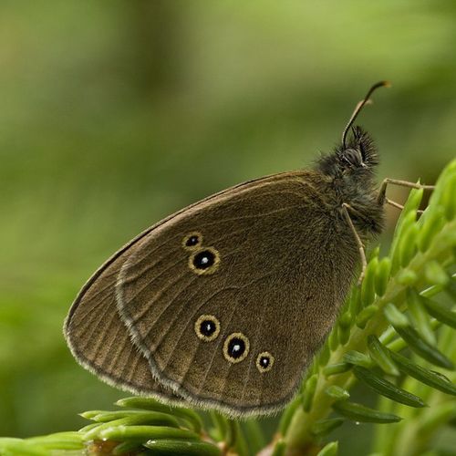 - Beschrijving: Bruine vlinder met aan de onderkant van de vleugels een opvallende rij geelgeringde ogen met een witte stip.