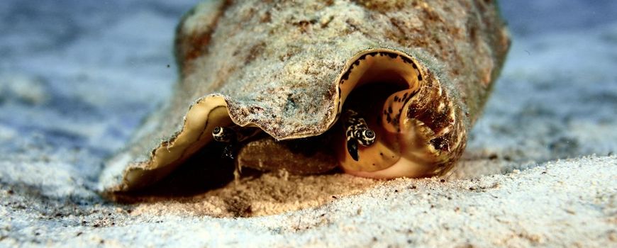 The Queen Conch (Aliger gigas) Hatchery in the Curaçao Sea Aquarium supplied the juvenile farmed conchs for the research. Some of the cultivated conchs first ended up in CARMABI‘s wet lab, which made its facilities available free of charge. In this wet lab it was evaluated how farmed and non-farmed conchs developed and behaved. The conchs were then released in small numbers with transmitters (tags) in seagrass fields near the Spanish Water. Seagrass beds are the best habitat for these snails. Queen Conch feeds on small algae and other organisms that live on the seagrass, which keeps the seagrass healthy. The released conchs were monitored via transmitters to analyze how they behave in nature and what their chances of survival are.