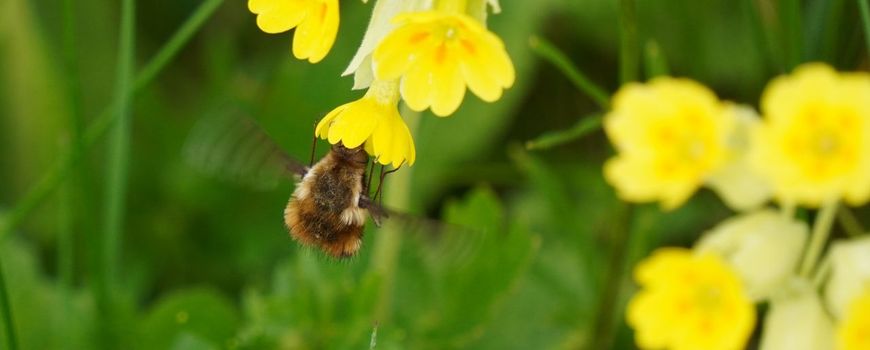 Images: Reinier de Vries (dotted bee-fly (Bombylius discolor) pays a visit to a common cowslip (Primula veris)); Wageningen University & Research